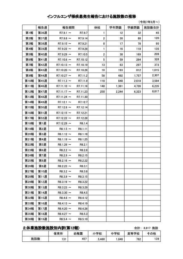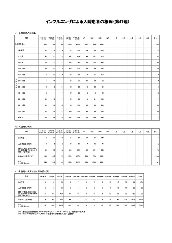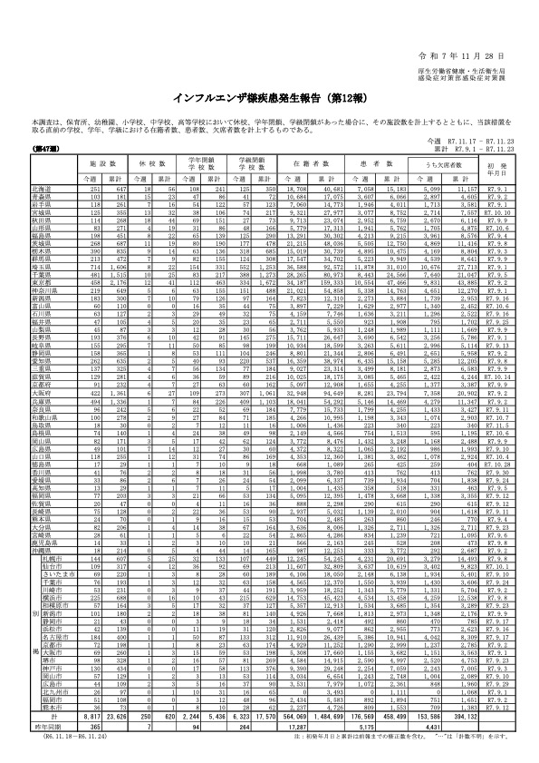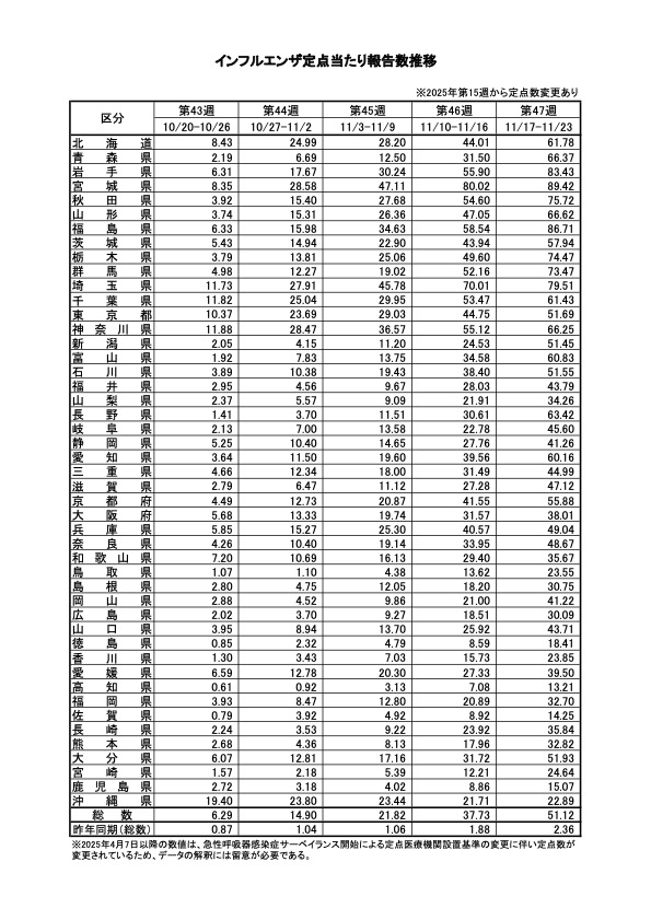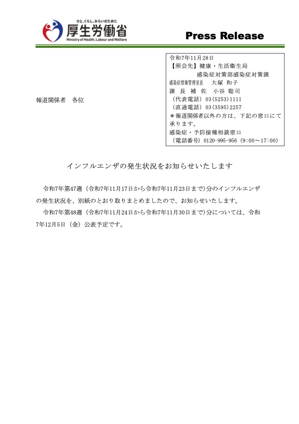 厚生労働省は11月28日、令和7年第47週(令和7年11月10日から令和7年11月16日まで)分のインフルエンザの発生状況を、取りまとめまとめ公表した。