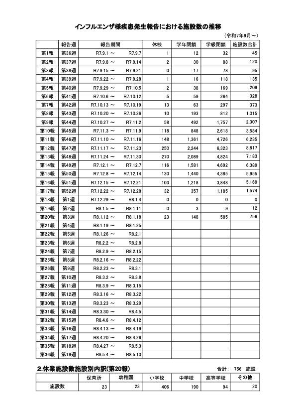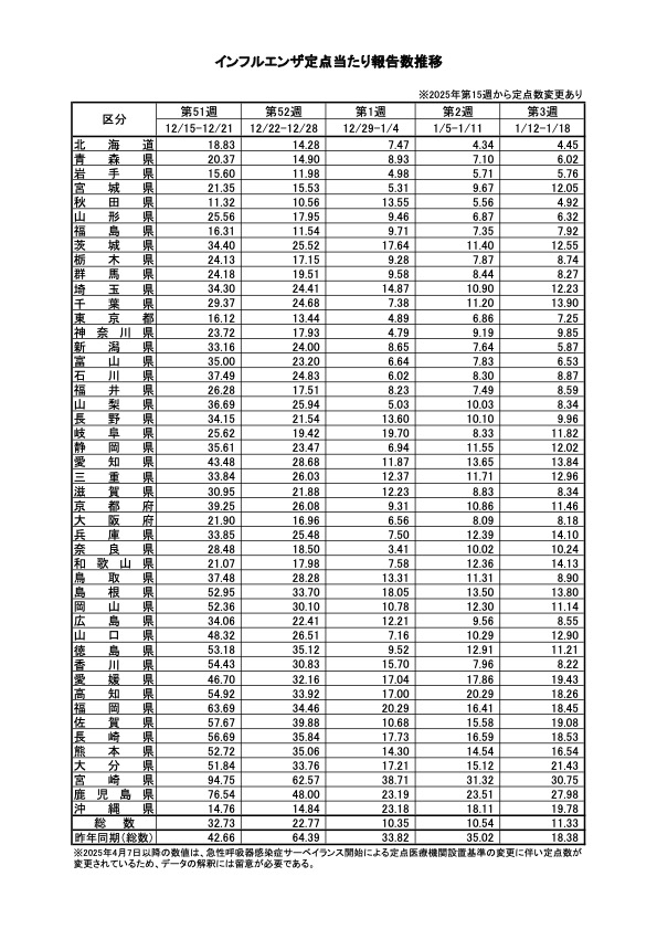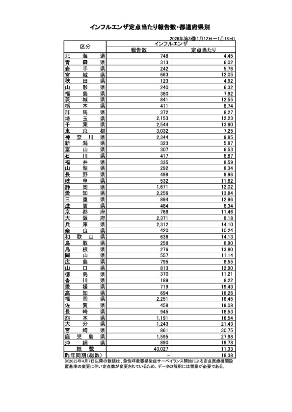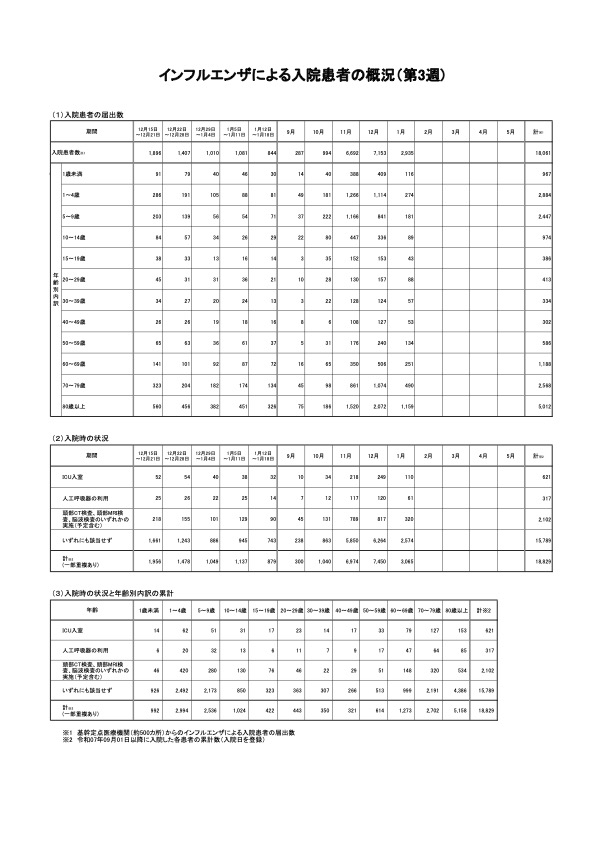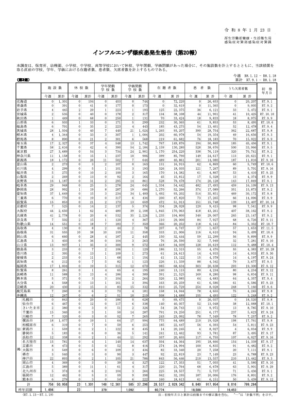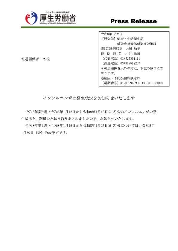 厚生労働省は1月23日、令和8年第3週(令和8年1月12日から令和8年1月18日まで)分のインフルエンザの発生状況を、取りまとめ公表しました。