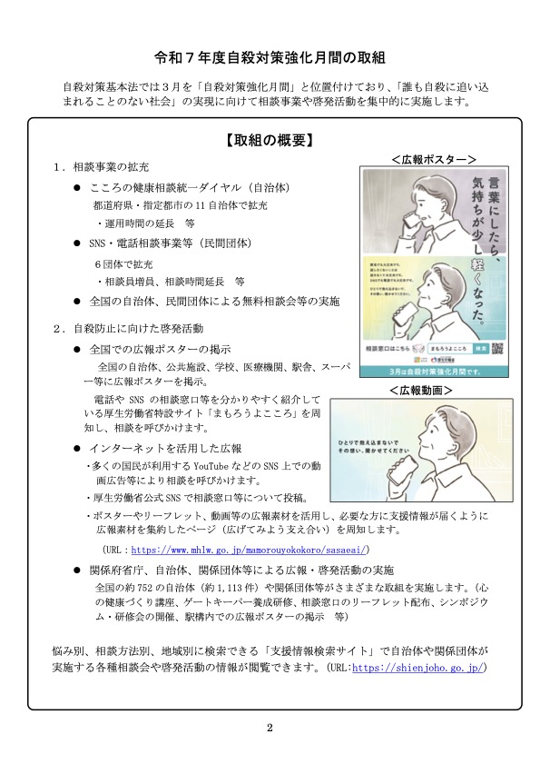 自殺対策強化月間では、電話やSNSによる相談支援体制の拡充や、主に中高年層に向けて、ポスターや動画等による相談の呼びかけなど、集中的な啓発活動が実施されます。